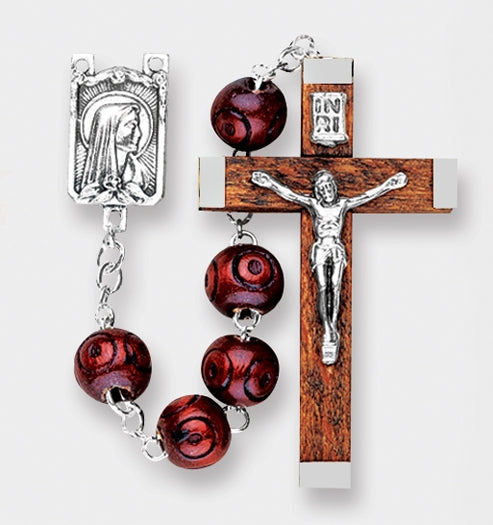 7MM Maroon Round Carved Wood Beads with Silver Oxidized Center and Wood Crucifix. 18"
