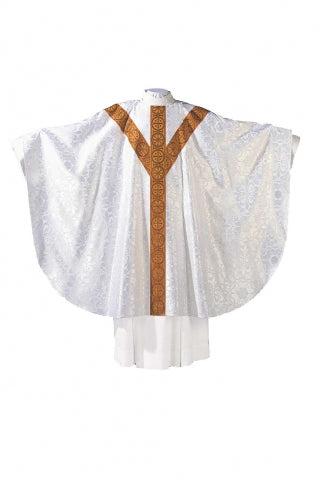 The chasubles have an ample Gothic cut with a 61" width and 53" length and include an inner stole. 51% Viscose, 49% cotton.