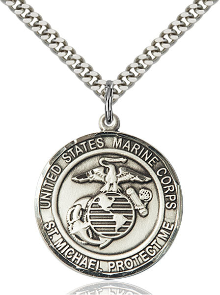 - Sterling Silver MARINES/ST. MICHAEL Pendant, Stainless Silver Heavy Curb Chain