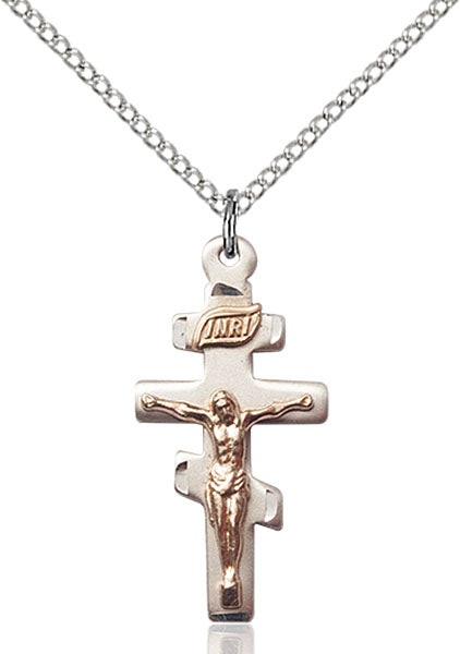 - 14kt Gold Filled Greek Crucifix Pendant, 18 inch Sterling Silver Curb Chain