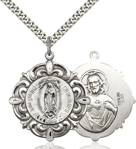 - Sterling Silver O/L of Guadalupe Pendant, Stainless Silver Heavy Curb Chain