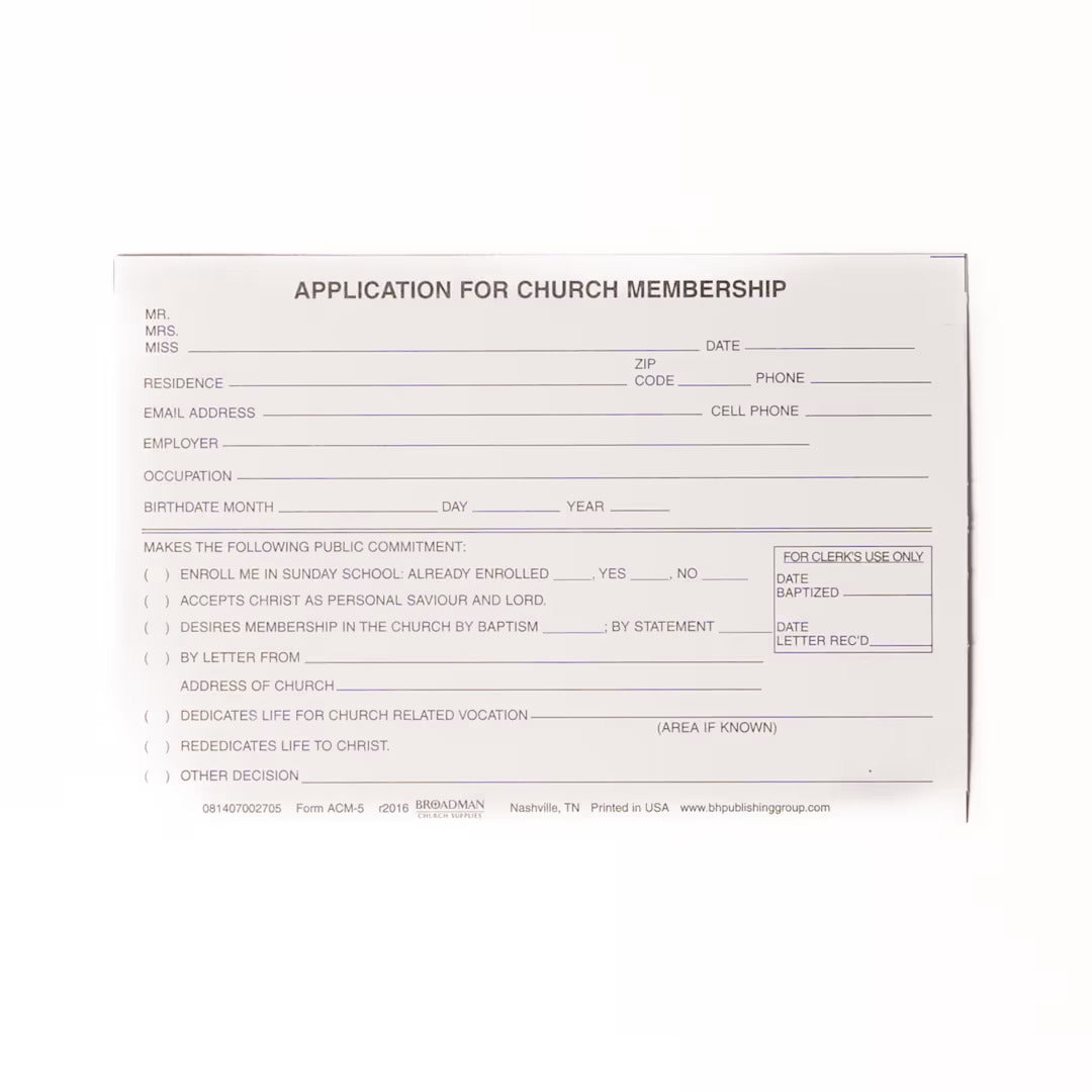 The Application for Church Membership: Form ACM-5 measures 6" x 4" and contains space for name, address, reason for application and other pertinent information to be filled out by the person presenting himself for church membership or other decision or church representative assisting the petitioner. This information will help place the petitioner in the hands of the most helpful people and groups. It will also let the church know if the petitioner is asking to join the church by baptism, statement or letter. The cards are shrink-wrapped in packages of 100.