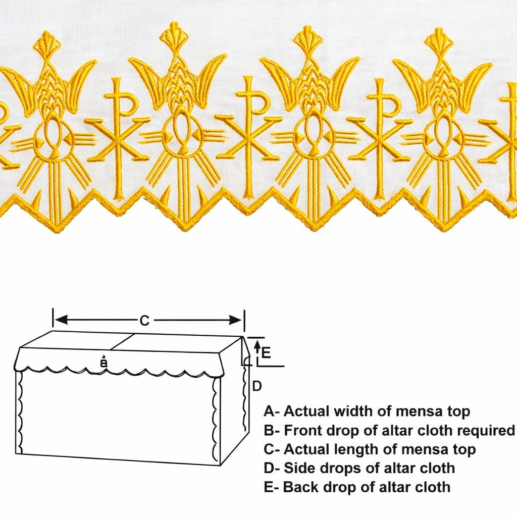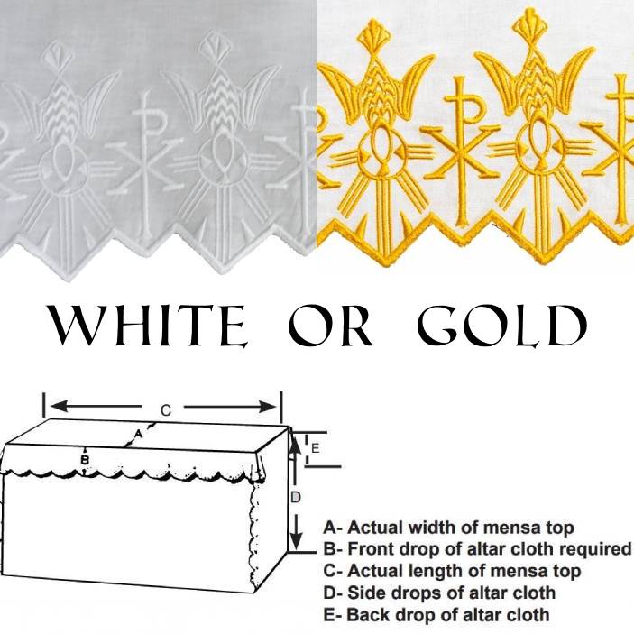 Altar Cloth made of superb quality 100% polyester with silk embroidery. These exquisite linens are hand scalloped and will give lasting elegance to any altar. These easy to maintain altar cloths for main and side altars are always custom-made. Available in White.