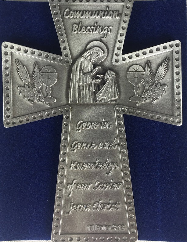 Communion Pewter cross for girl. Measures: 5" L, 3 1/2" W "Communion Blessings Grow in Grace and Knowledge of our Savior Jesus Christ" - 11 Peter 3:18