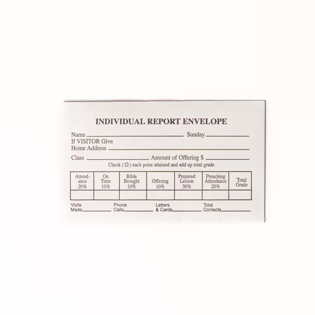 The Individual Report Envelopes: Form 15 are smaller (No. 3 size) than bill-size. Each envelope has space for offering given and 6-point record reporting. Opens at top - Gummed flap "Kwik Open" feature 4 1/4" x 2 1/8 " Shrink-wrapped in packages of 100.